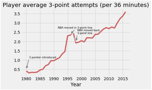 3-point line', xy=(1998, 2.), xytext=(1998.5, 2.4), fontsize = 9, arrowprops=dict(facecolor='grey', shrink=0, linewidth = 2))