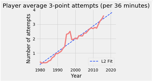 Here we are analysing the average number of 3 point attempts for each season in a time limit of 36 min[an interval corresponding to an approximate full NBA game with adequate rest]. We compute this metric using the number of 3-point field goal attempts (fg3a) and minutes played (mp) and then plot the result using matlplotlib.