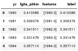 We can fit a linear regression model to this curve to model the number of shot attempts for the next 5 years. We have to transform our data using the VectorAssembler function to a single column. This is a requirement for the linear regression API in MLlib.