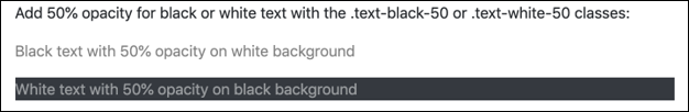 In addition to that, you can also add 50% opacity using the “.text-black-50” or “.text-white-50” classes.