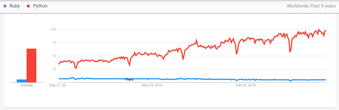 | Ruby’s use has gone down in the list of top 10 languages, from fifth place in 2014 to tenth place in 2018. | Whereas, Python has steadily kept its popularity, moving from the fourth most used language in 2014 up to the third spot in 2015, where it remained through 2018. |
