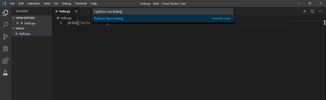 Even though linting runs automatically when you save your file. You can run linting by selecting the following in the command palette.